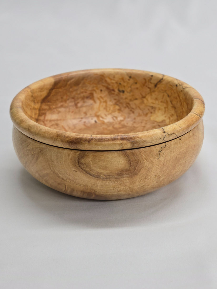 Medium size bowl with a well balanced classical shape highlighted by a nice rim on top. The Maple wood conserves the attractive marks of its previous “inhabitants”…Food safe finish.
